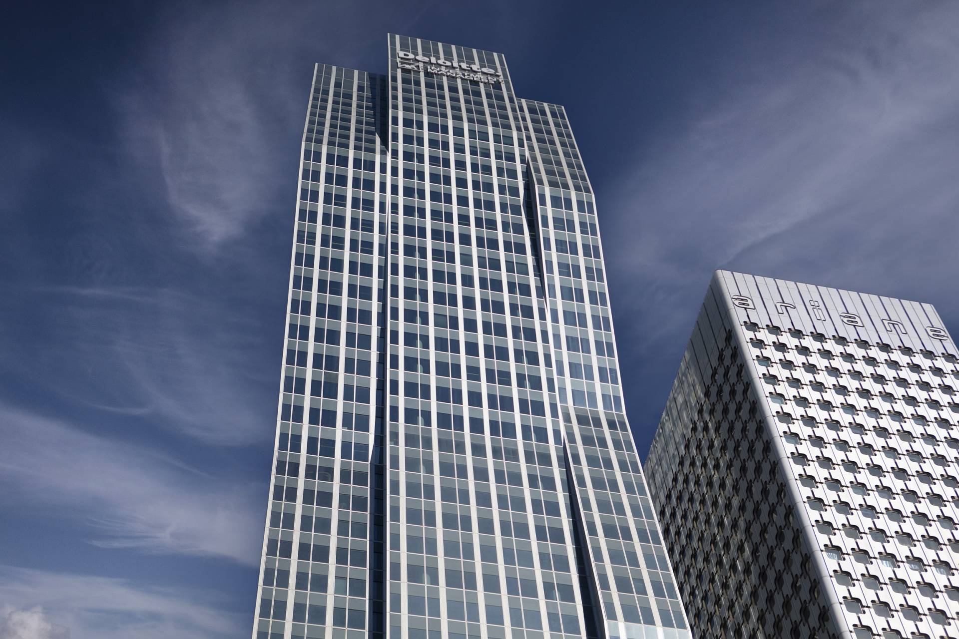 This unique building has a double-skin façade made of glass and aluminum, allowing natural light to enter the offices.