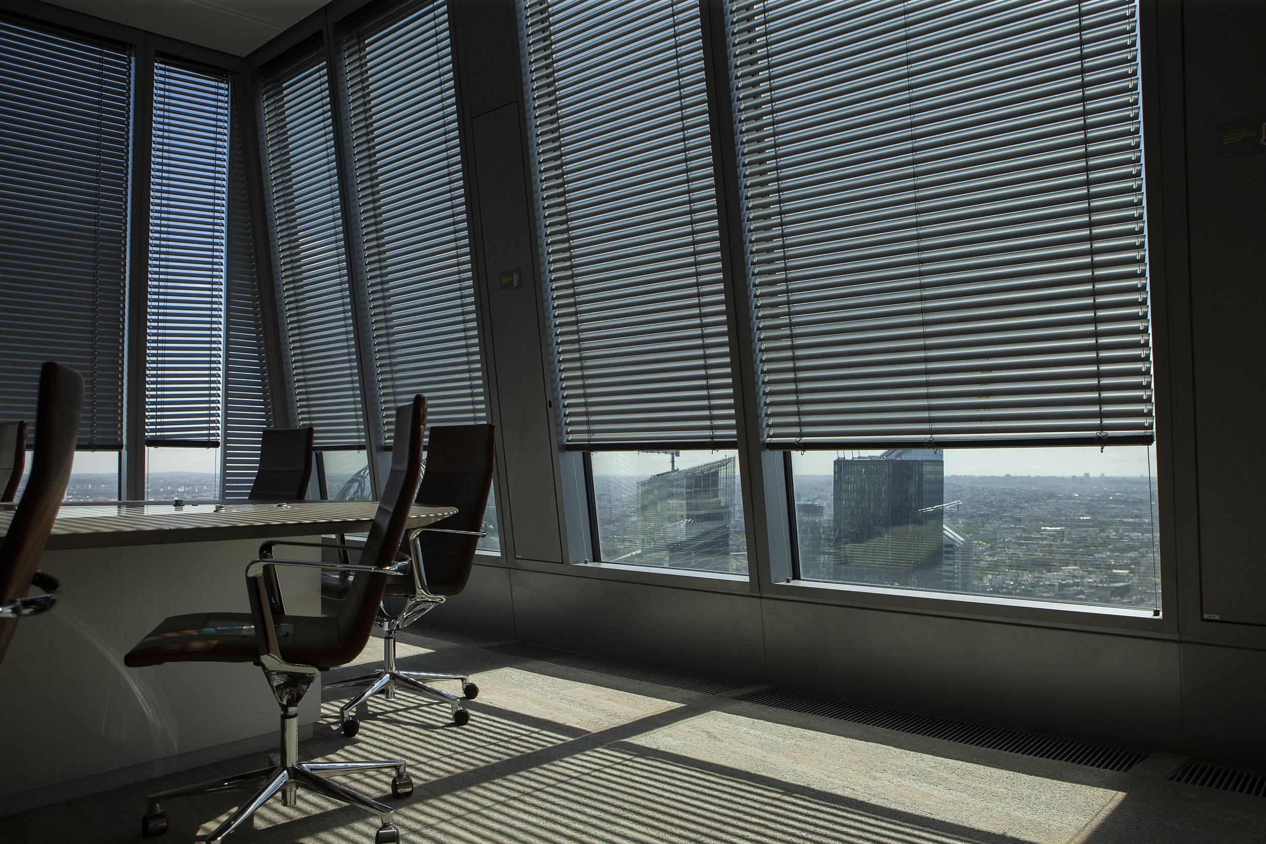 Our motorized Venetian blinds with C50 slats are integrated into this façade for complete control of light and shadow throughout the day. This efficient system reduces energy consumption for lighting and air conditioning.
