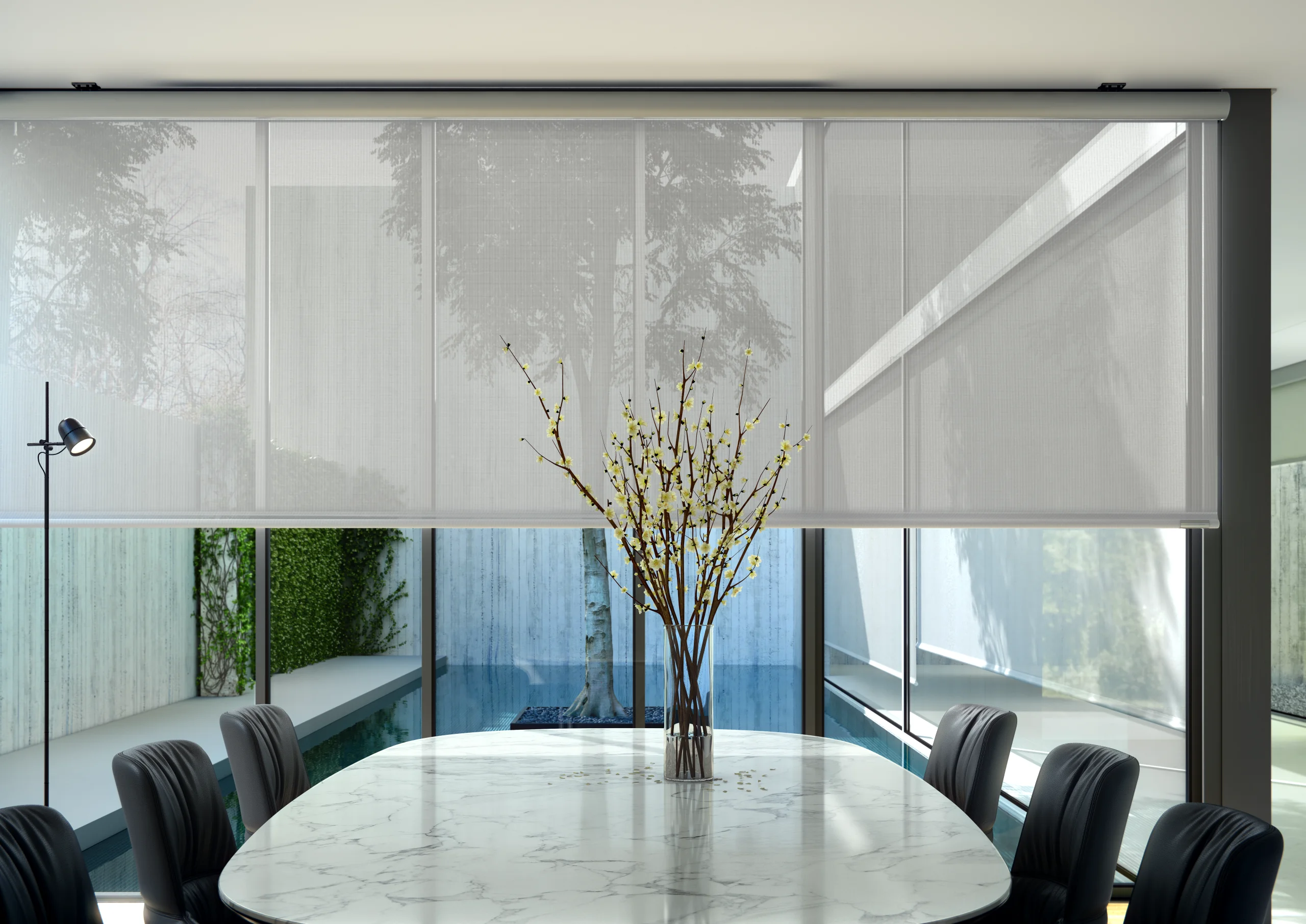 A single bracket with stainless steel rod allows the installation of two O-Box shades at different heights.