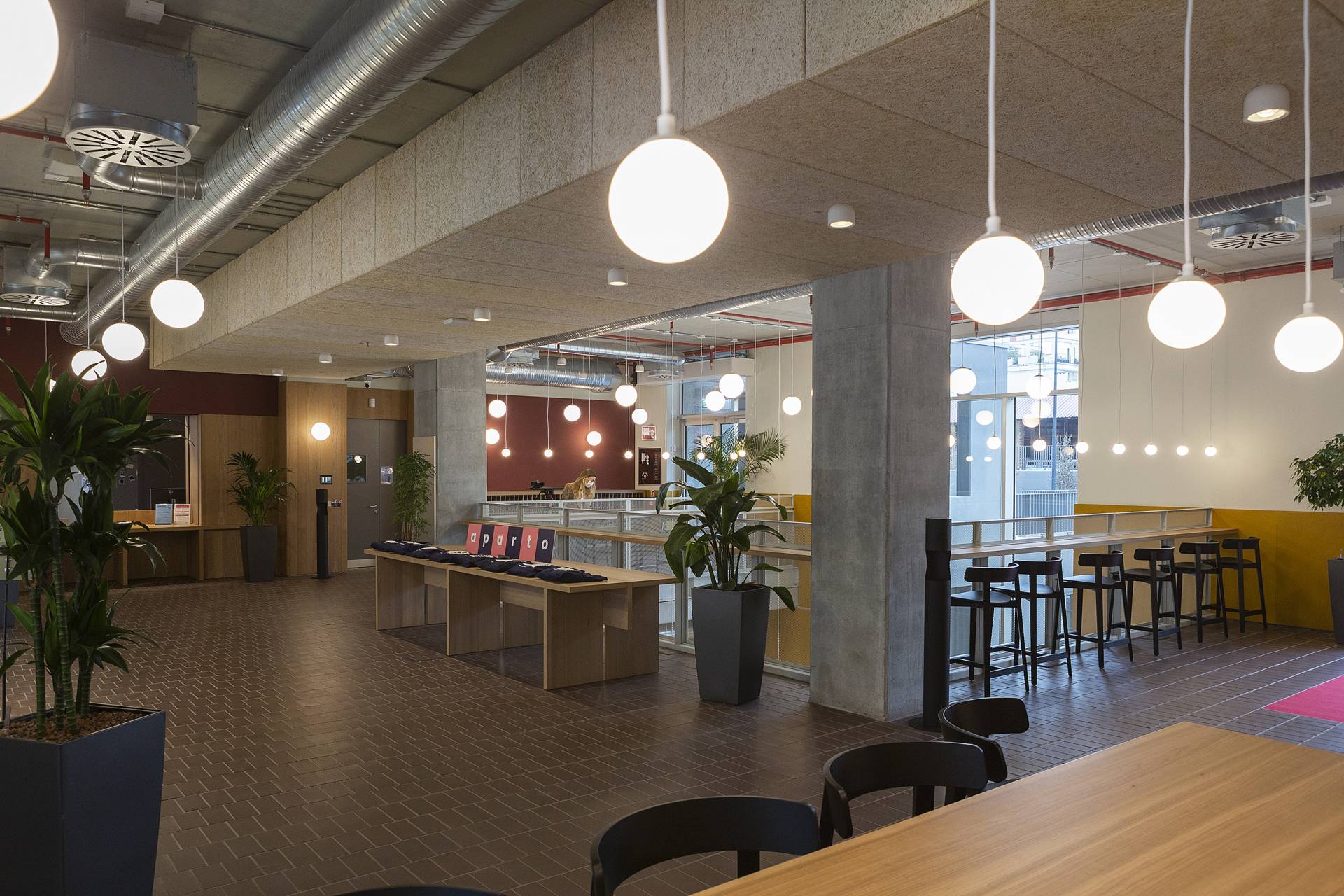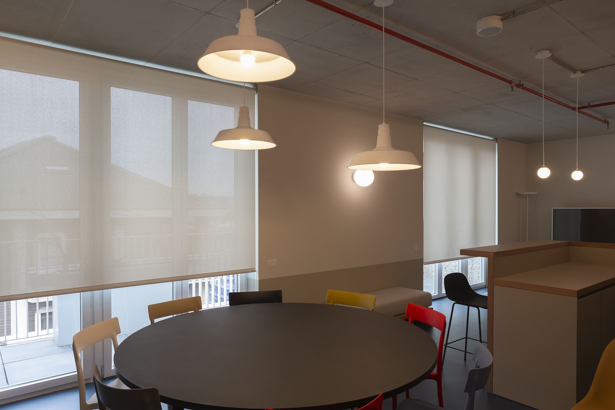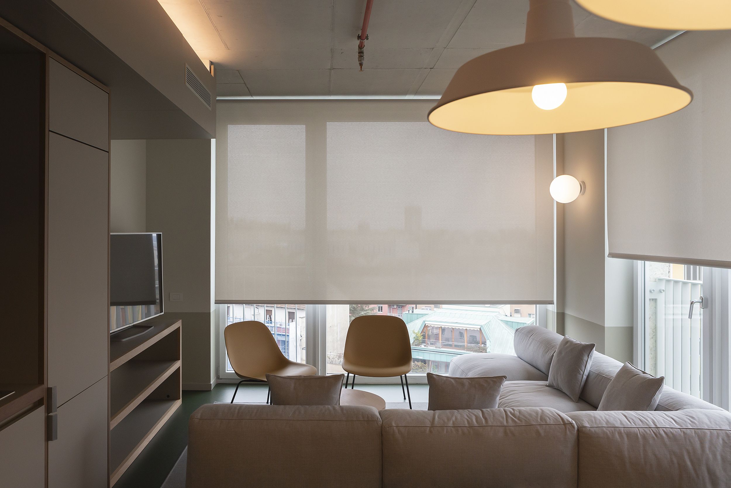 Pour garantir intimité et efficacité énergétique, nos stores Premium Plus avec tissu Screen ou Blackout sont stratégiquement installés dans le hall d’accueil, les blocs cuisines et les chambres. Le tissu Screen offre une qualité acoustique et une intimité grâce à son facteur d’ouverture de 1%, tandis que le tissu occultant assure une obscurité totale la nuit.