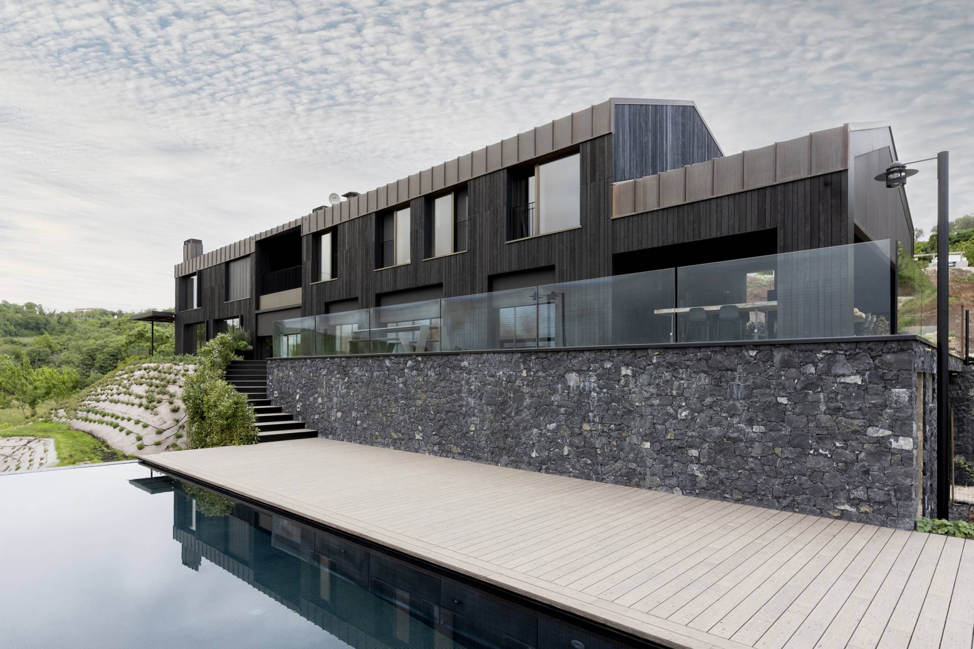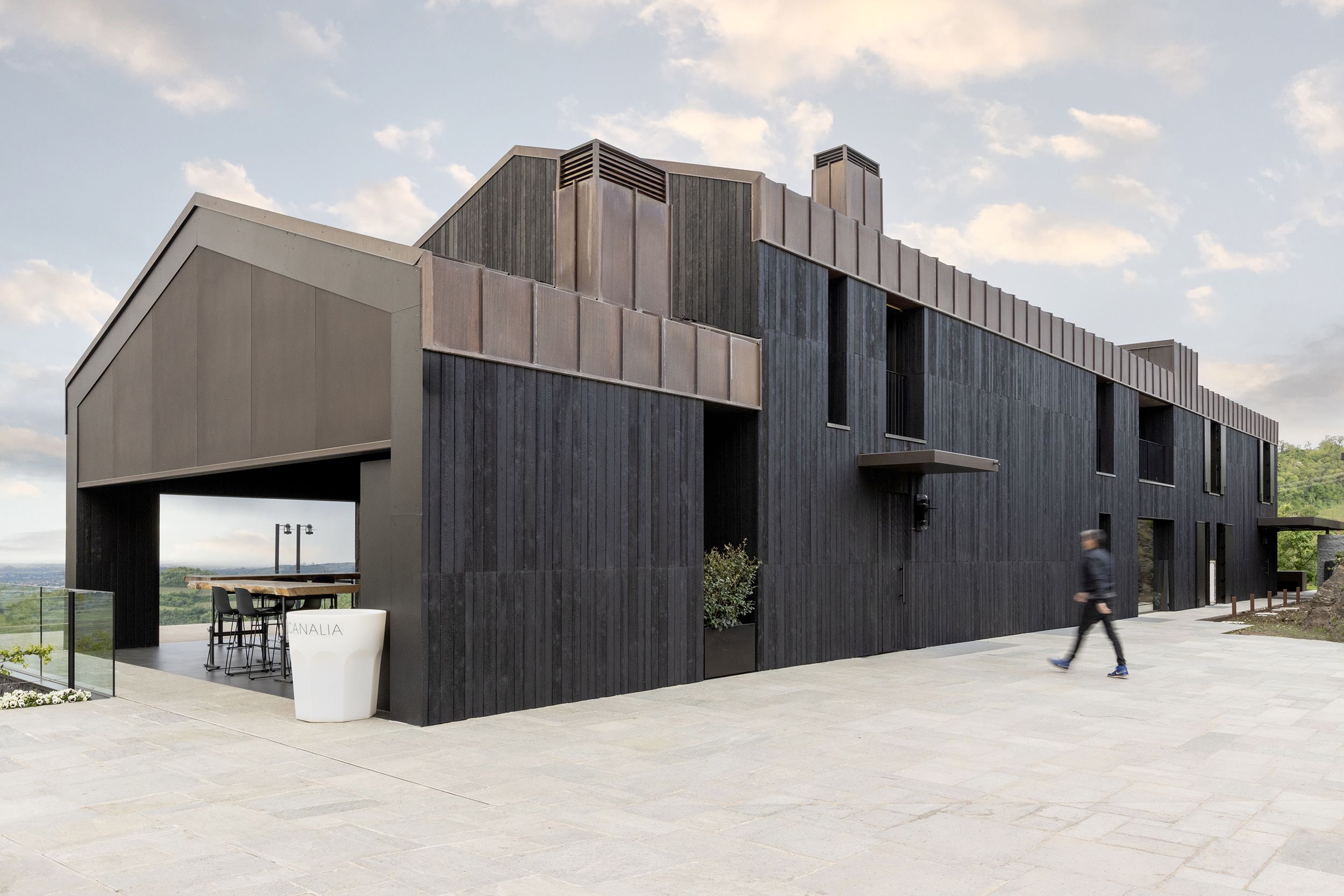 L’entreprise Volcanalia est revêtue de bois traité selon la technique japonaise traditionnelle Yakisugi, un procédé utilisant le feu pour créer une finition carbonisée.
