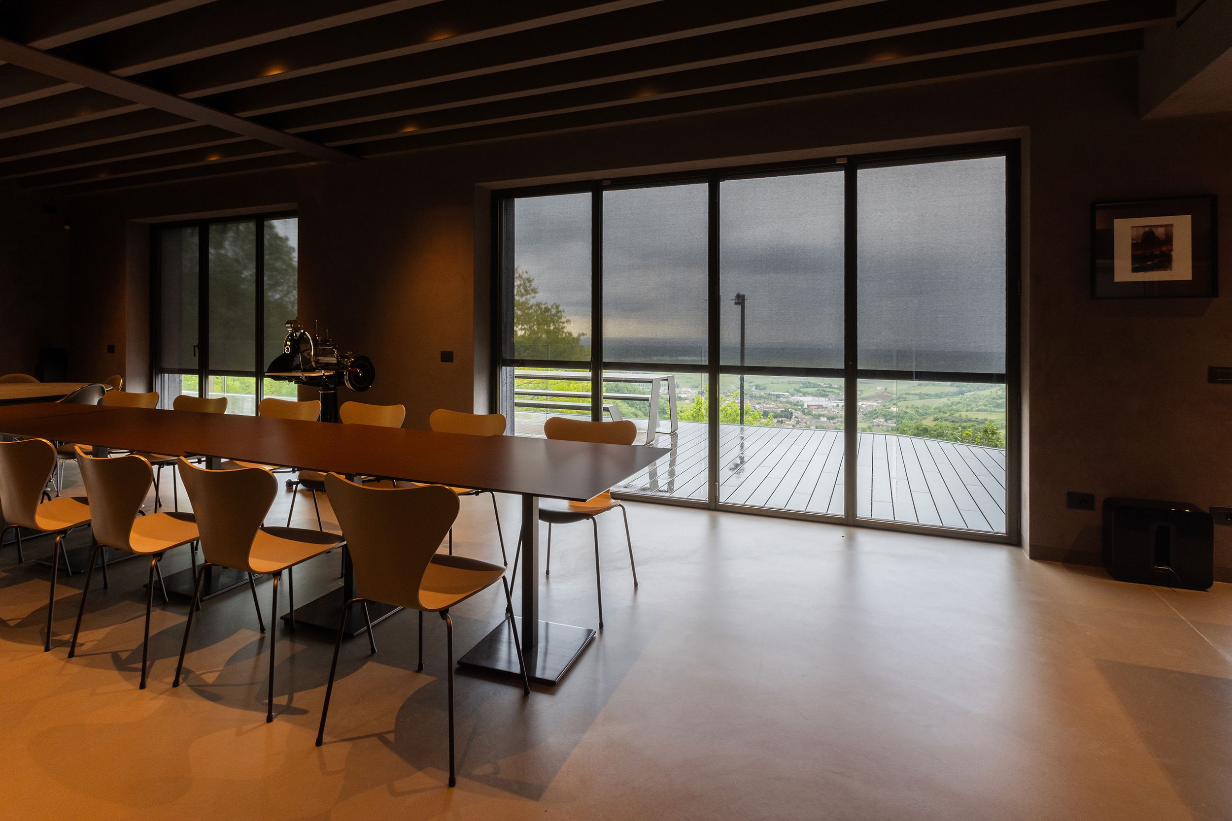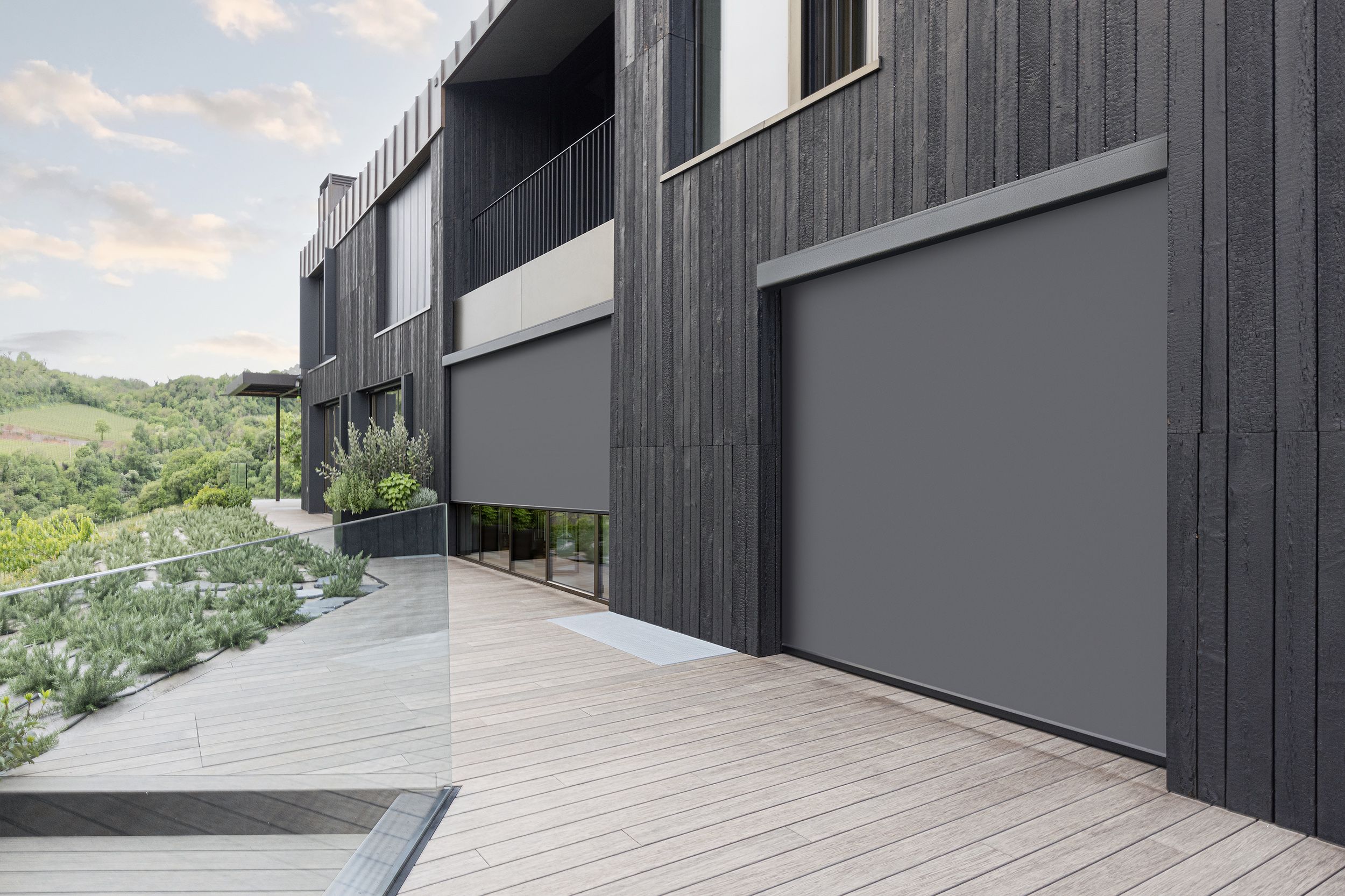 Les architectes ont choisi le système Z-Box de Bandalux, avec guides en acier inoxydable et un tissu Screen de couleur ébène, s’intégrant parfaitement à l’ensemble du projet. Il valorise non seulement l’esthétique du bâtiment, mais offre également une protection optimale contre le vent et le soleil, tout en maintenant une vue dégagée sur le magnifique vignoble environnant.