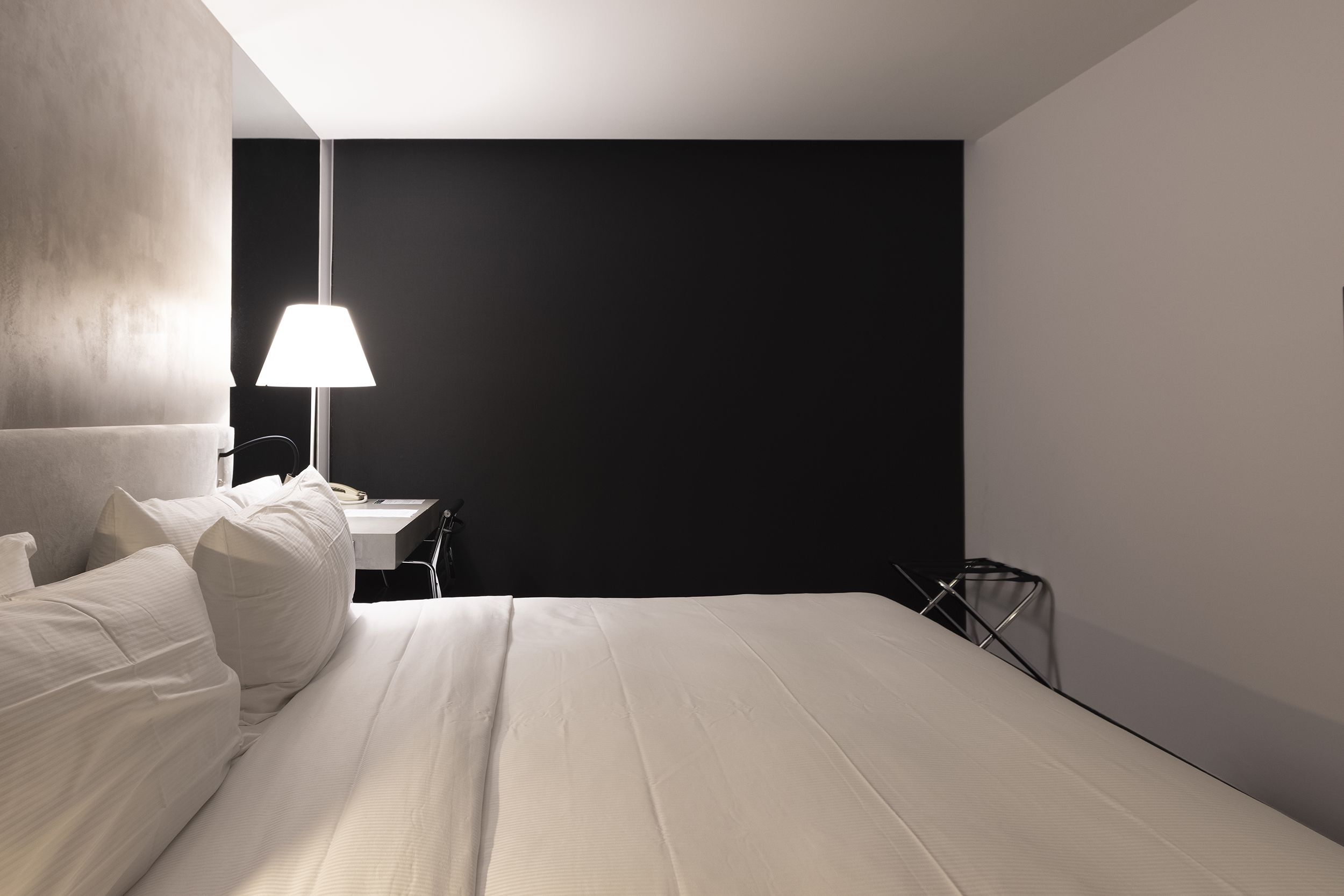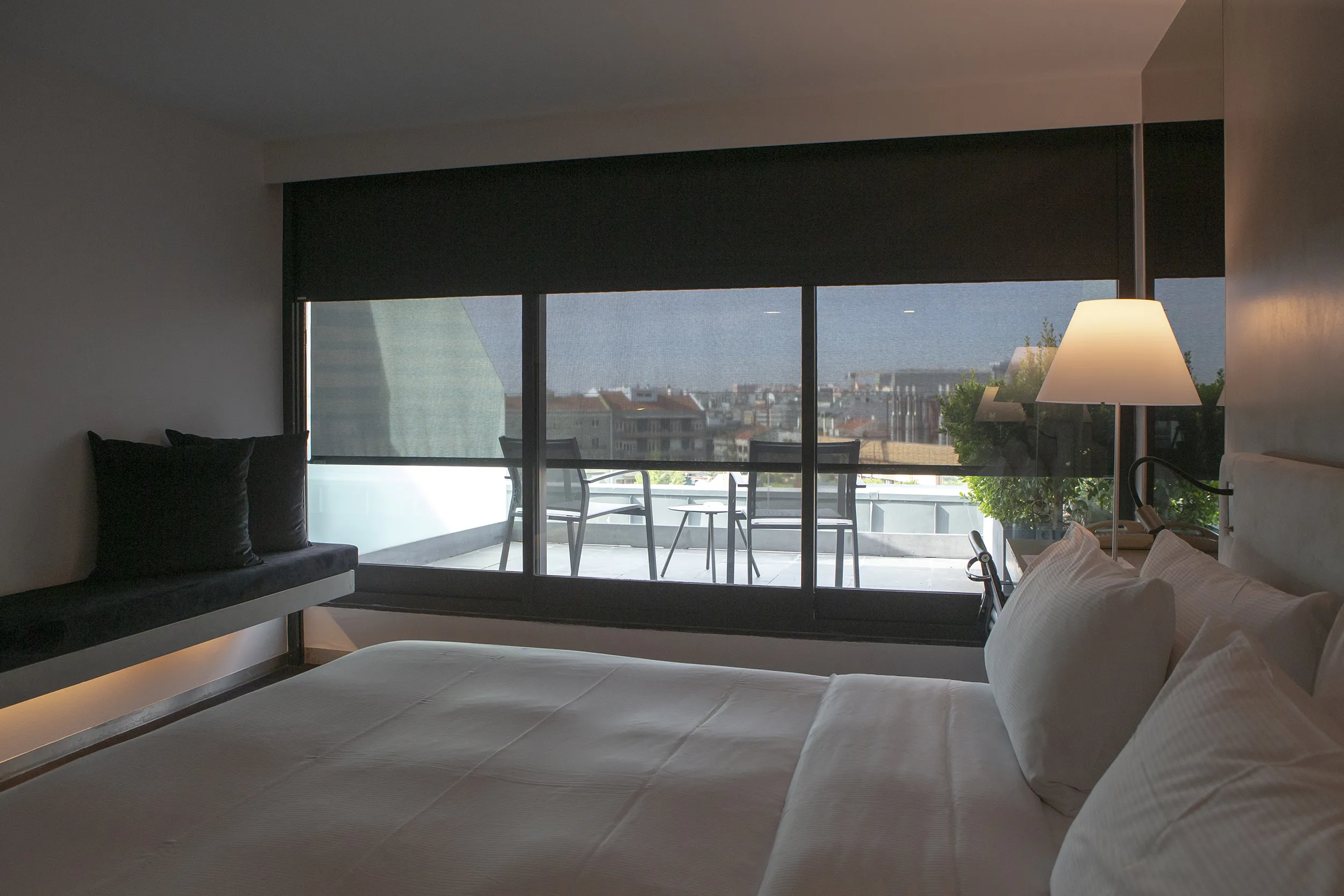 Le tende, configurate con tessuto blackout, offrono la massima privacy agli ospiti. Come complemento, le tende a rullo Premium Plus con Screen nel colore Ebony offrono la migliore alternativa durante il giorno, mantenendo entrambi i sistemi il design e la vista esterna.
