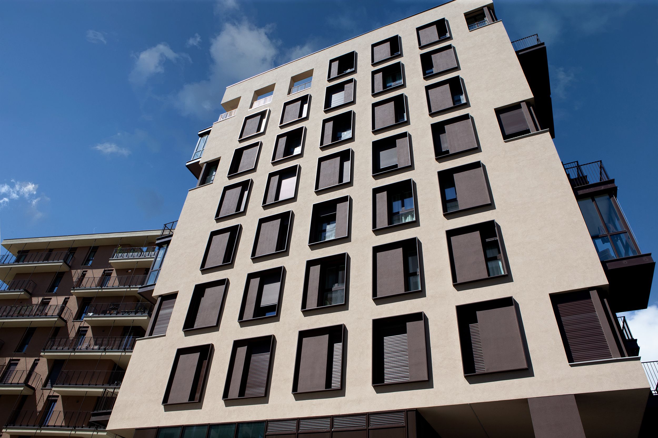 Per questo progetto, Bandalux ha fornito le sue tende a rullo Premium Plus guidate, che offrono sia protezione solare sia una tensione precisa del tessuto sui tre piani vetrati della loggia. Il tessuto scelto, Screen, completa la facciata, mantenendo la palette di colori coerente dell’edificio e garantendo al contempo la funzionalità.