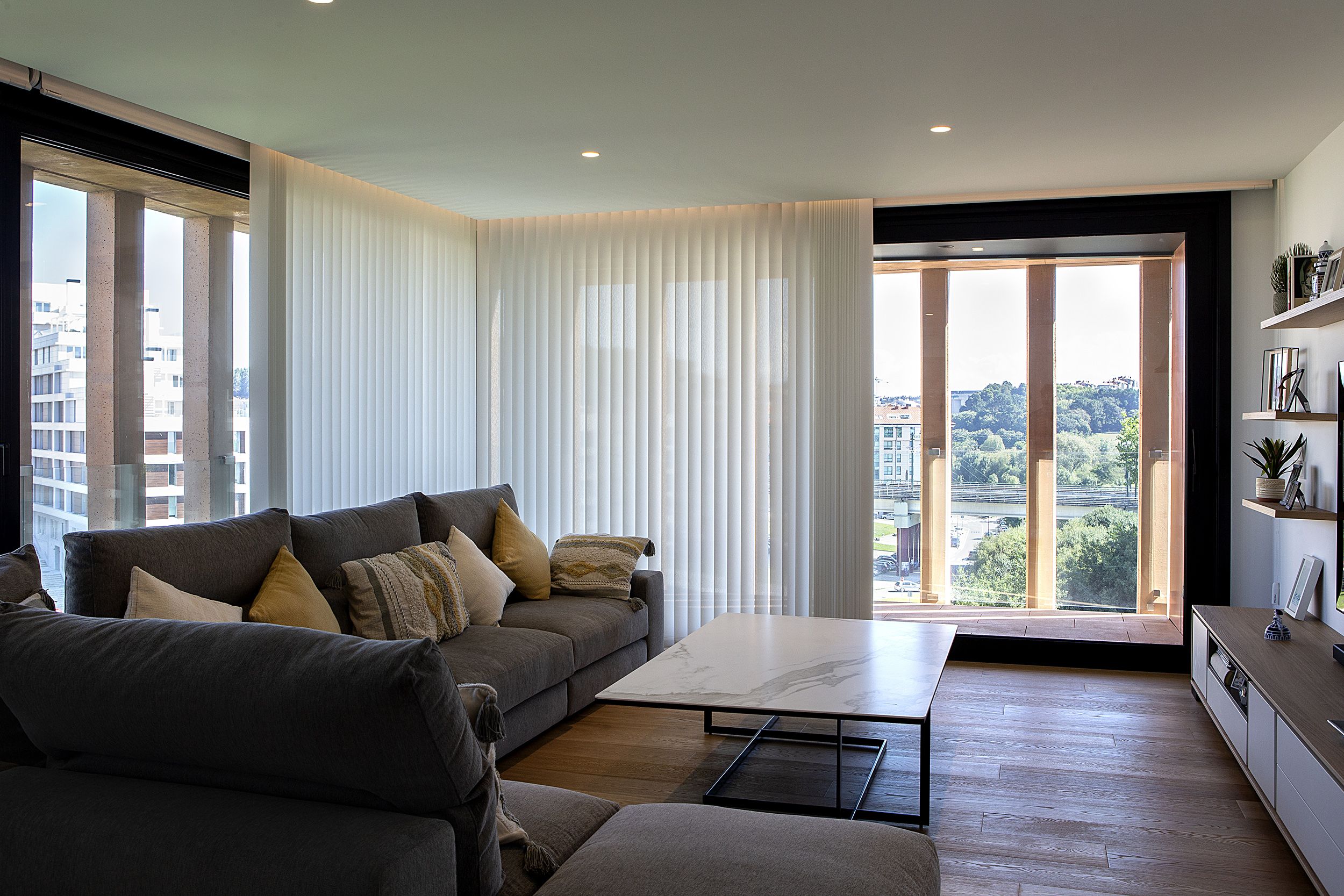 Vertical blinds and roller shades were chosen to ensure visual harmony and manage sunlight.
