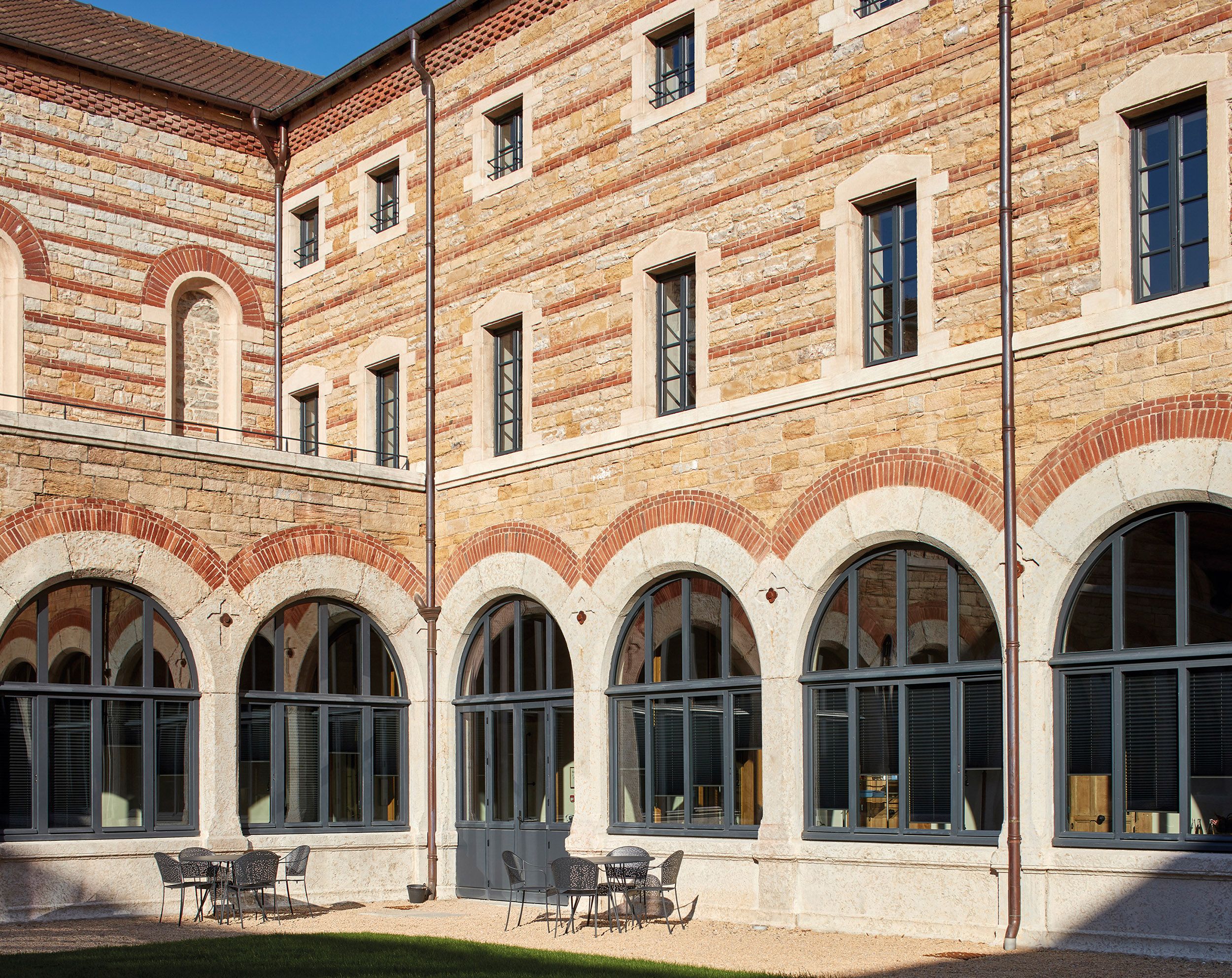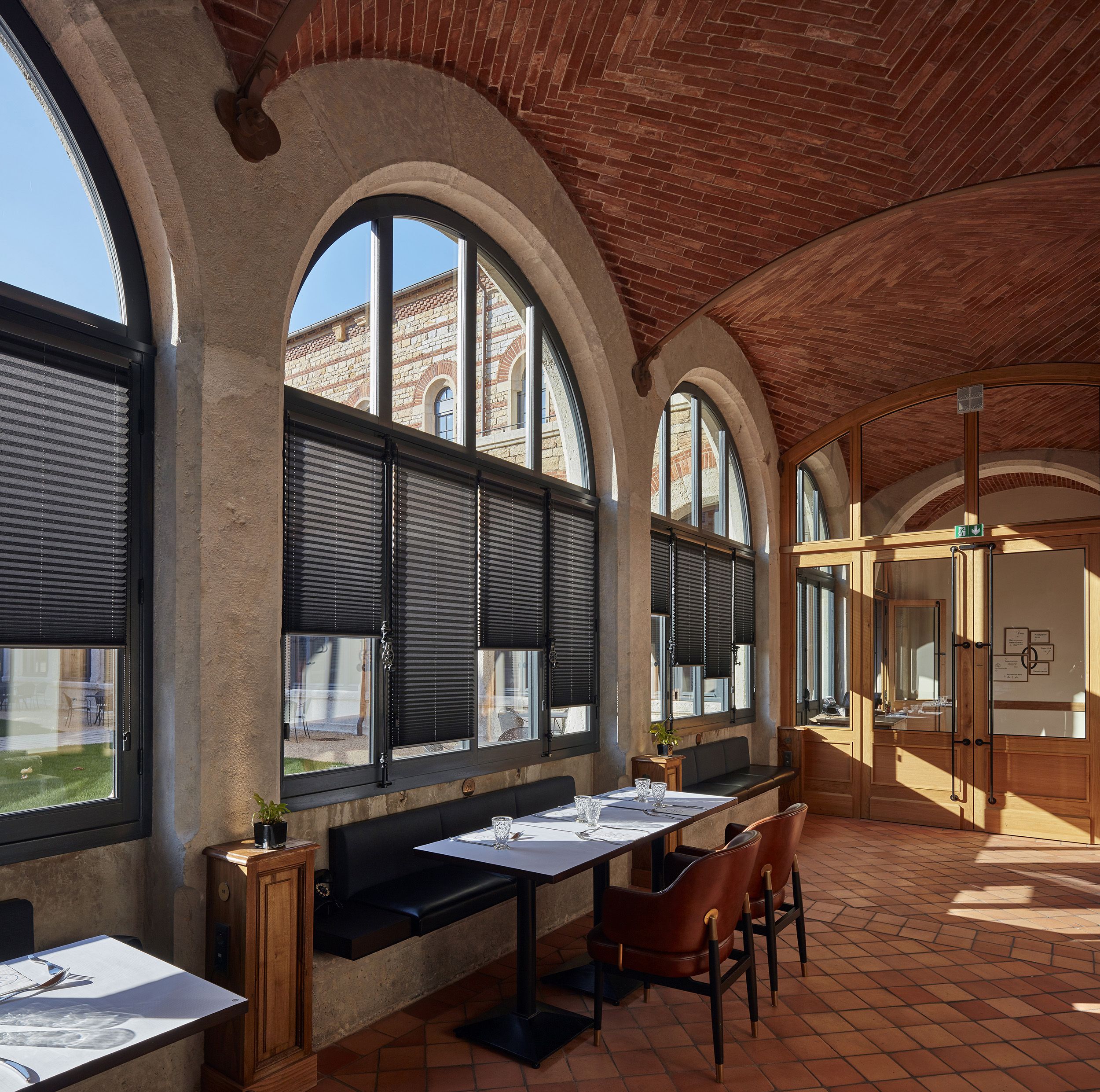 The cloister area was designated for the hotel’s gourmet restaurant, offering beautiful views of the garden. To control the amount of light entering the space, over 250 Bandalux pleated shades with chain operation were installed in dark tones, matching the furniture.