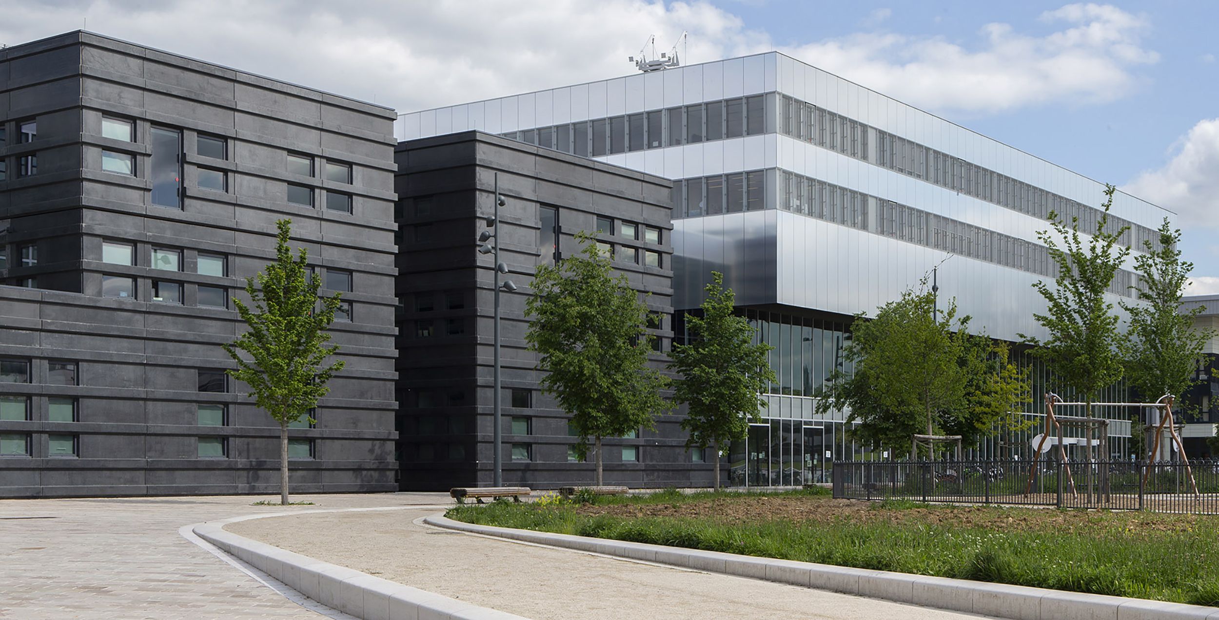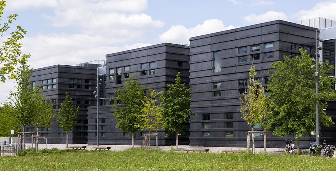 Bandalux B-Box roller shades with High Performance fabric are installed in selected buildings. Their side guides provide complete blackout when needed, and the anthracite-colored box matches the window frames, fully integrating the solar protection system into the architecture.